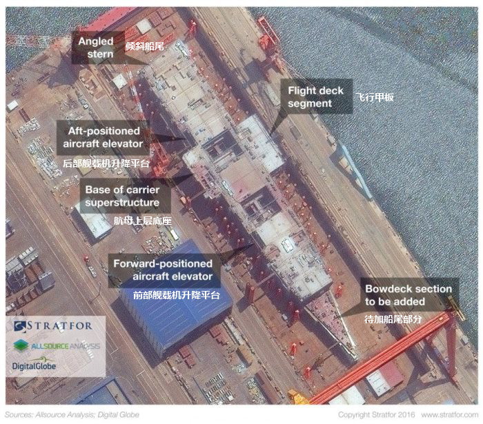 这张图片源于Stratfor在AllSource Analysis的合作伙伴,显示了001A型航母项目建造采用模块化方式,各部分先分别建好然后进行配合。这种方式可以缩短建造时间,更为灵活。尽管001A型航母入列可能需要数年时间,但按照现在的速度,001A型航母可能在2017年初就能完工。