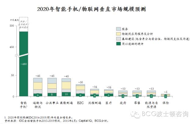 BCG的调研显示,至2020年,有别于高度整合的智能手机市场,整体规模近两万亿元人民币的物联网商机将平均地分散在十个主要的垂直行业。其中,以运输、制造及公共行业对于物联网的需求最为旺盛(如下图)。