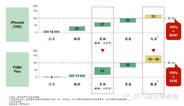 举例而言,若以iPhone 6和FitBit Flex作为智能手机时期及物联网时期的代表产品,并仔细分析两个产品的成本构成,我们会发现两个不同时期产品的硬件成本在售价中的占比从43%大幅下降到17%,而投资大幅地向软件、服务甚至是品牌经营转移(如下图)。