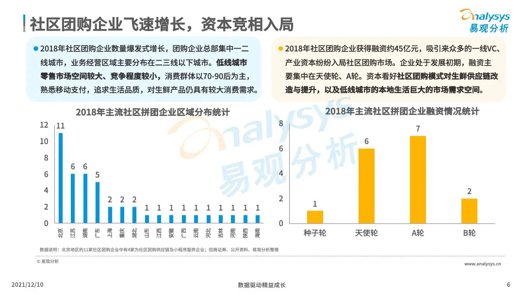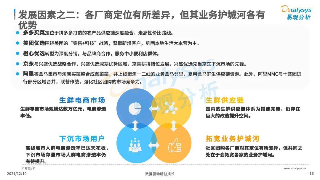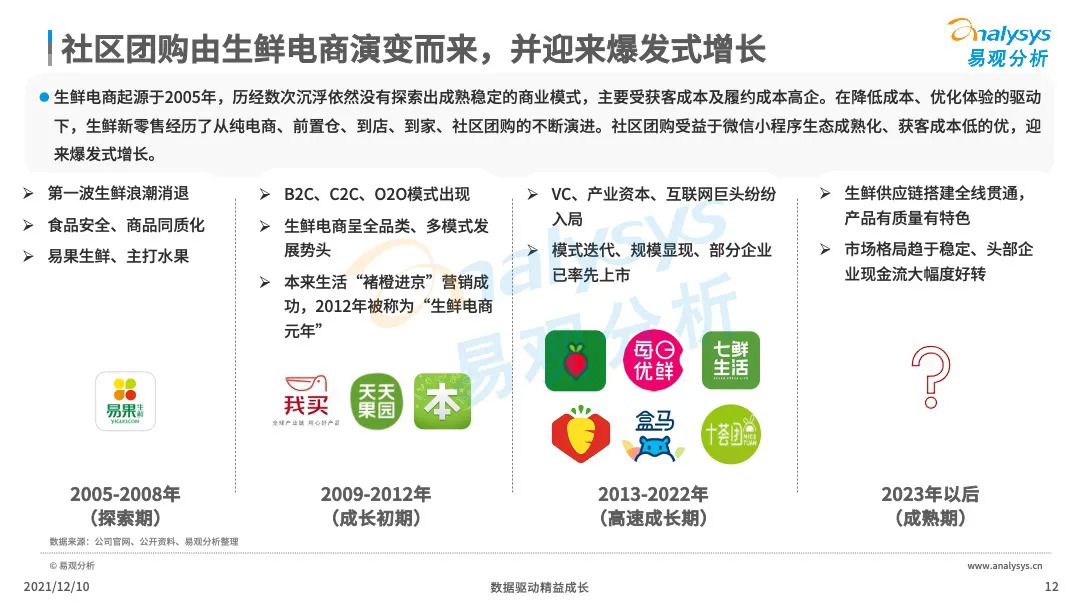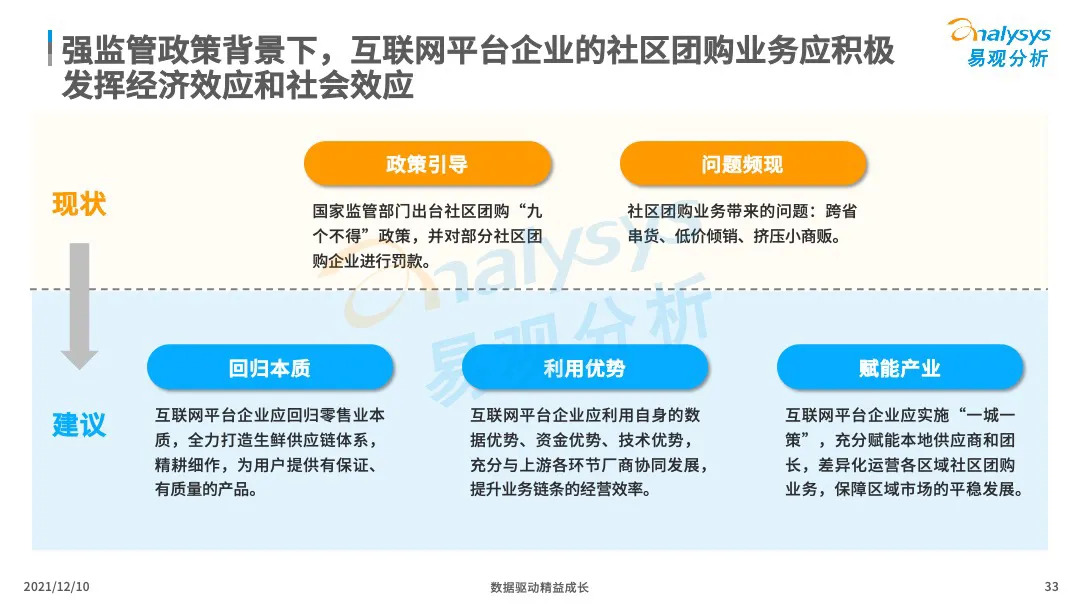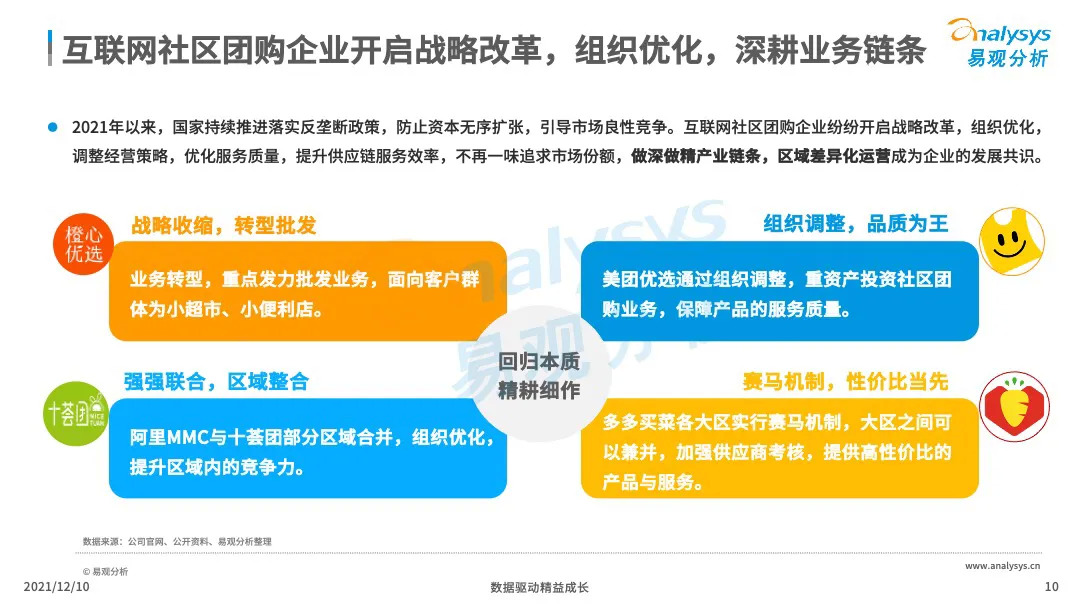 易观分析:微信小程序的成熟化,下沉市场消费群体对生鲜的需求提升,催生了社区团购市场的爆发式增长。VC、产业资本、互联网巨头等亲自下场,市场掀起来新一轮的社区团购大战,市场乱象、恶行竞争此起彼伏,国家监管层面出台社区团购政策,引导企业回顾行业本质,平稳健康发展。本文将从主要阐述社区团购的发展历程、发展现状、典型厂商分析、行业的未来发展趋势分析。