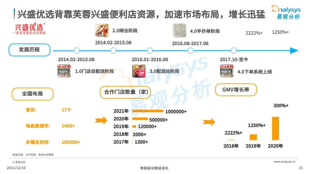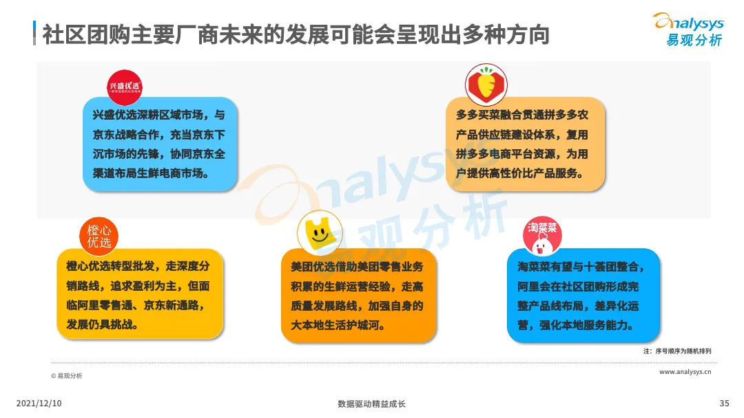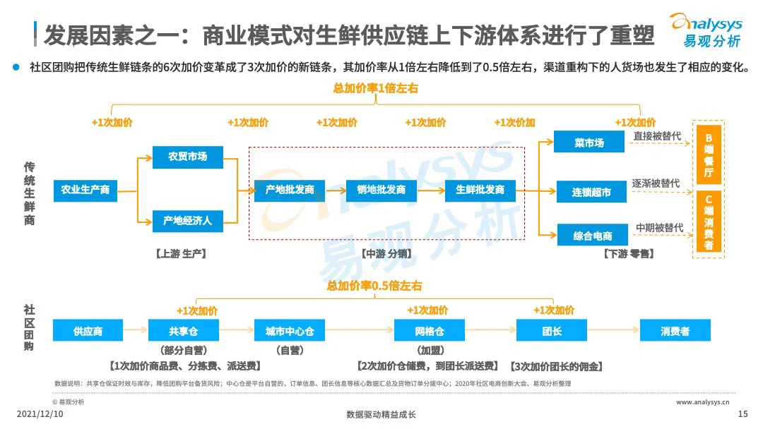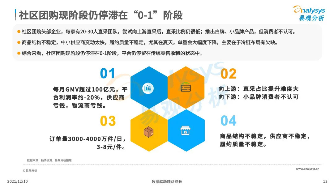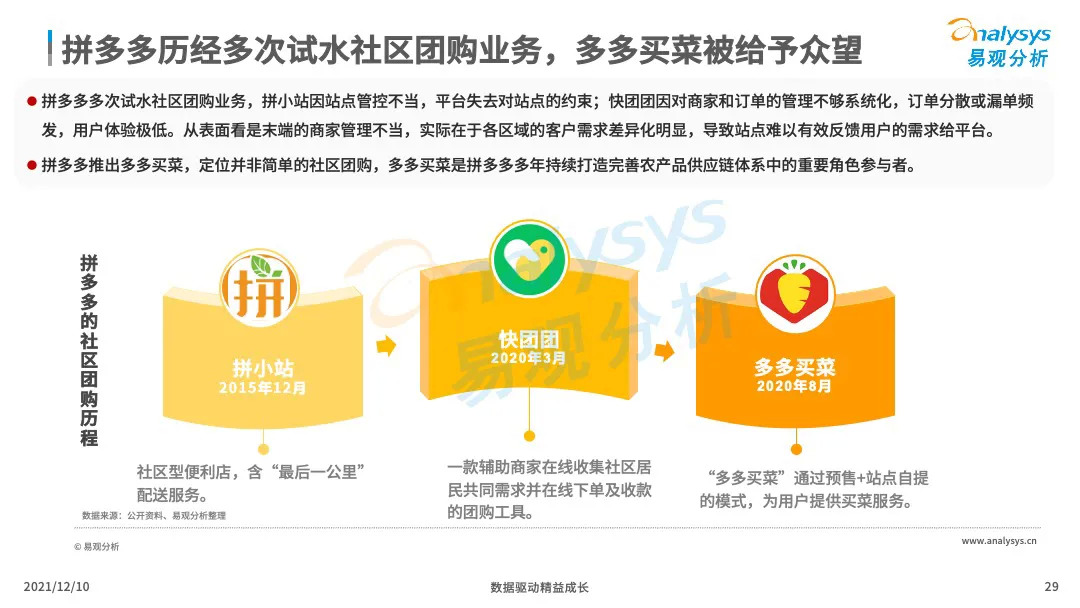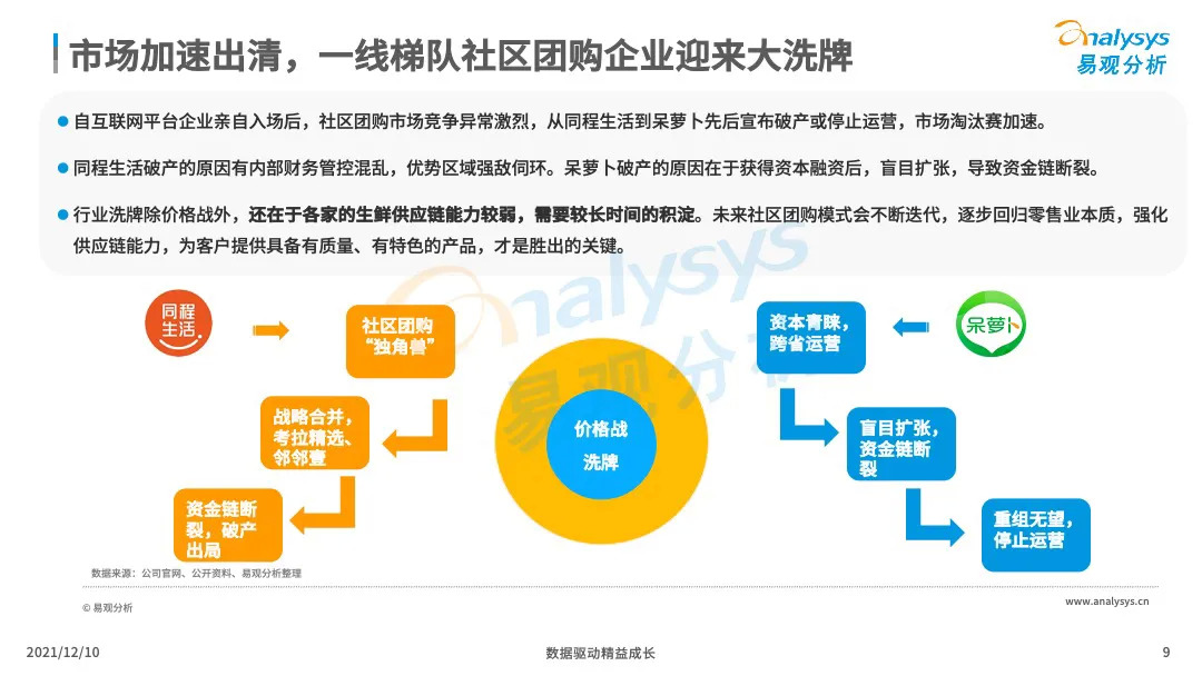 易观分析:微信小程序的成熟化,下沉市场消费群体对生鲜的需求提升,催生了社区团购市场的爆发式增长。VC、产业资本、互联网巨头等亲自下场,市场掀起来新一轮的社区团购大战,市场乱象、恶行竞争此起彼伏,国家监管层面出台社区团购政策,引导企业回顾行业本质,平稳健康发展。本文将从主要阐述社区团购的发展历程、发展现状、典型厂商分析、行业的未来发展趋势分析。