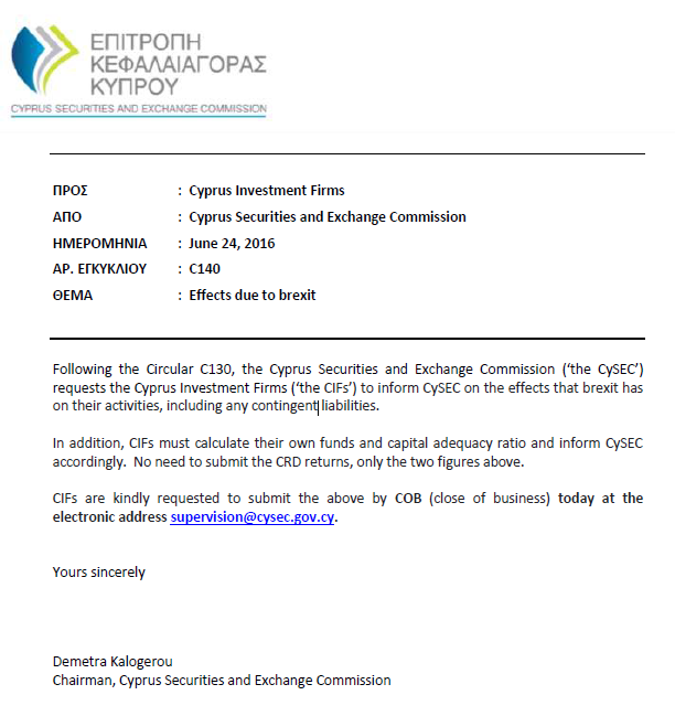 另一个欧洲监管机构-塞浦路斯证监会(CySEC)也发布了有关英国脱欧影响的公告。CySEC要求,在6月24日,塞浦路斯投资公司(CIFs)必须向监管机构提交资产和资金充足率两个数据,同时告知英国退欧对公司运营的影响。