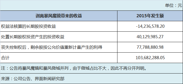 不过,处置暴风魔镜给暴风集团带来的投资收益却是实打实的。2015年年报显示,在失去控制权后,暴风魔镜剩余股权按公允价值重新计量产生的利得7778万元,剥离一事总计给上市公司带来的收益达到了1.03亿元。