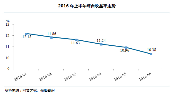 另一项逐月下滑的数据是P2P网贷行业的综合收益率。2016年上半年,网贷行业总体综合收益率为11.31%,相比2015年全年网贷行业总体综合收益率下降了198个基点(1个基点=0.01%)。2016年6月,网贷行业综合收益率为10.38%,同比下降了379个基点。