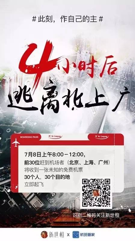 2016年7月8日早上,航班管家与新世相策划的“逃离北上广”事件引爆,各种大V,直播,各大媒体,网红等等参与下,一个说走就走的旅行成了热门话题,从上午就已经有自媒体开始解密营销逻辑,或者采访事件策划者等等。