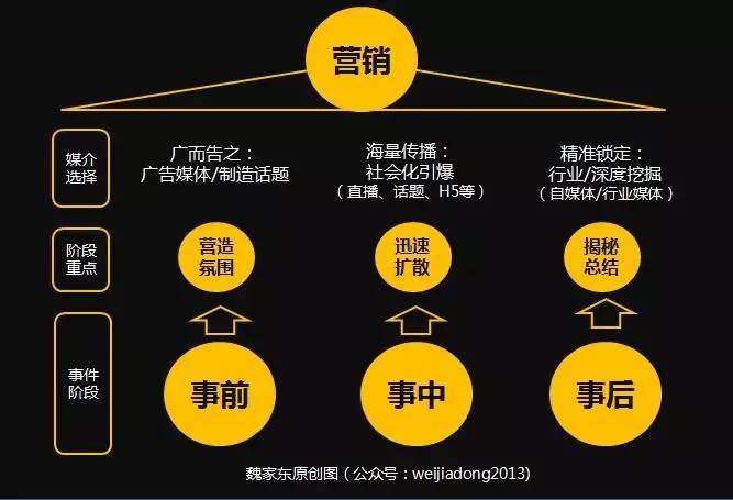 在事件前、中、后,需要有不同维度的内容策划,侧重点也不一样,营造一个事件引爆的氛围,需要多媒体的组合,在事件现场通过直播等社交化易引爆媒体的传播放大,事件就更容易扩散出去,制造了一个刷屏的效果,但不能少了后边的汇总文章,这些揭秘爆料都是很重要的,那些数据和幕后,很多人都在等着看,刷屏刷的好不好,就差最后一篇文章了。