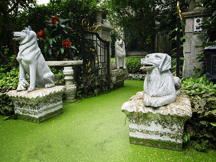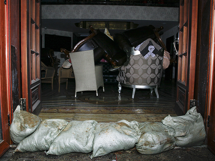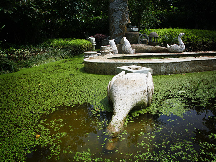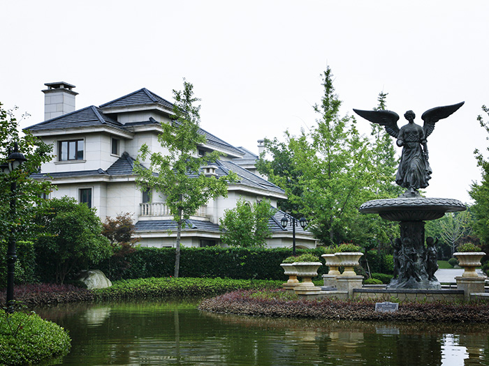 长岛别墅区大门口积水依然齐腰,中心花坛屹立着名为“守护水之天使”的雕像。