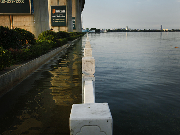 毗邻汤逊湖的路面和别墅依然浸泡在水中。