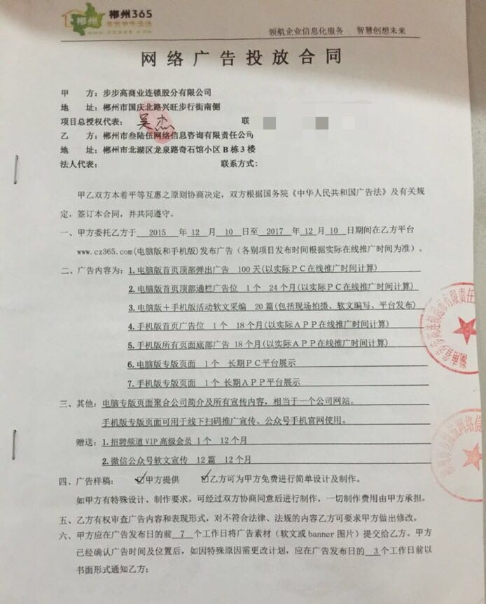 据介绍,在2015年9至10月间,步步高郴州新天地的市场部主管吴杰联系到包括口袋郴州、郴州焦点文化传媒有限公司、郴州酷海晨文化传播有限公司等在内的八家文化传播公司,称步步高郴州新天地百货项目开业及后续营业需要做宣传推广,希望能够达成合作。