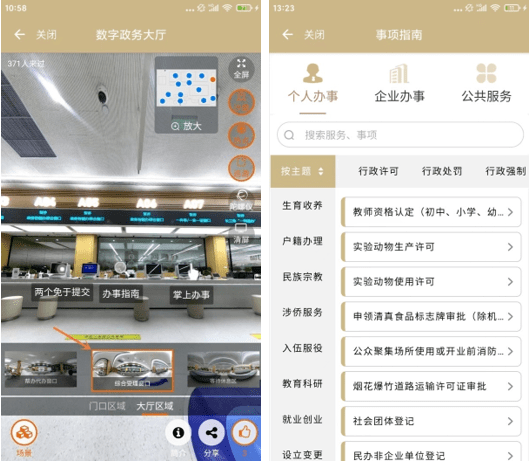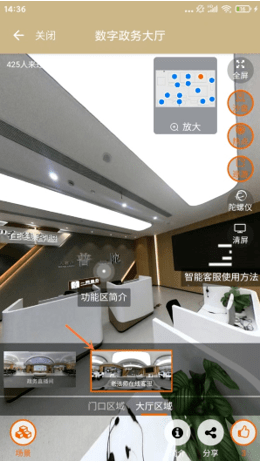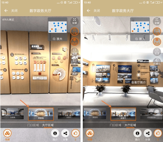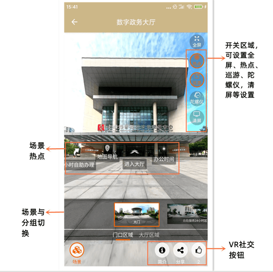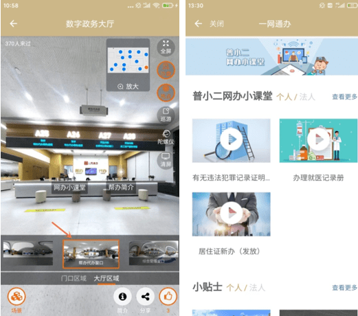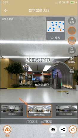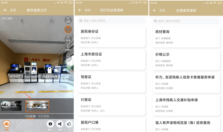 数字政务大厅场景与分组里的每项设施都与实体大厅一一对应,通过场景切换可直达各服务区域。目前展示的是一层大厅服务区域,其中包含了24小时自助服务区、咨询服务台、随申码体验区、政务公开服务区、综合受理窗口、帮办代办窗口以及自有的普陀政务直播间等,为市民提供服务简介、办事指南、服务内容等信息,从而构建起一个集访问、浏览、查询等多种功能于一体的移动端虚拟政务服务大厅。