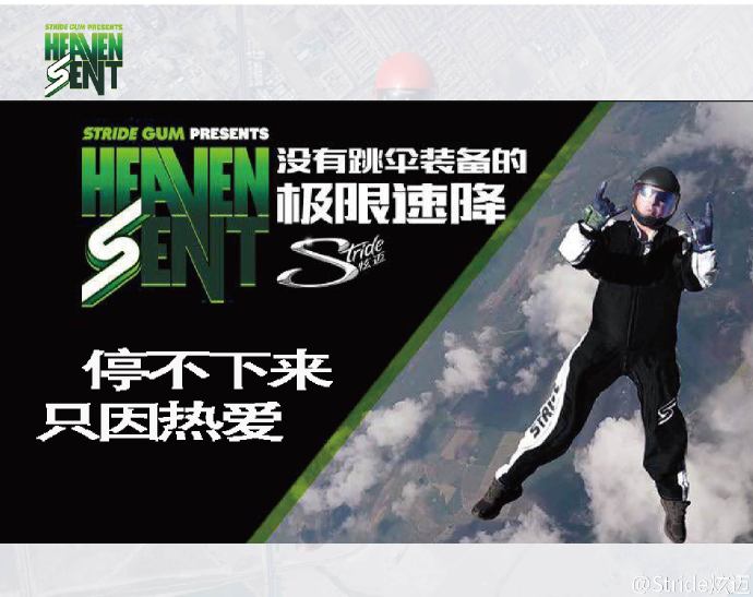 赞助极限运动,近几年不仅只是运动品牌们喜欢的宣传方式了,消费品牌也对它越来越有兴趣。极限运动所代表的冒险精神,有谁会不喜欢呢?管它跟口香糖有没有关系,(从科学的角度,跳伞的时候吃口香糖是非常危险的),不过只要让你觉得,吃炫迈跟跳伞一样酷就可以了。