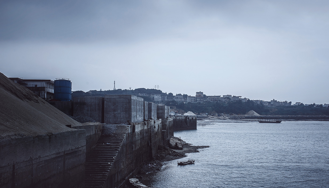 这是南日岛的石南码头,由于潮水、风雨、烈日和潮湿空气的浸洗,石墙石阶已经发黑。暴雨将至,天色黑沉沉压下来,小渔船泊在码头边,随潮起伏。码头一旁的海岸是平缓的海滩,叶片细长的巨大风车,拉开间隔,沿岸树立,那是岛上的风力发电机组。