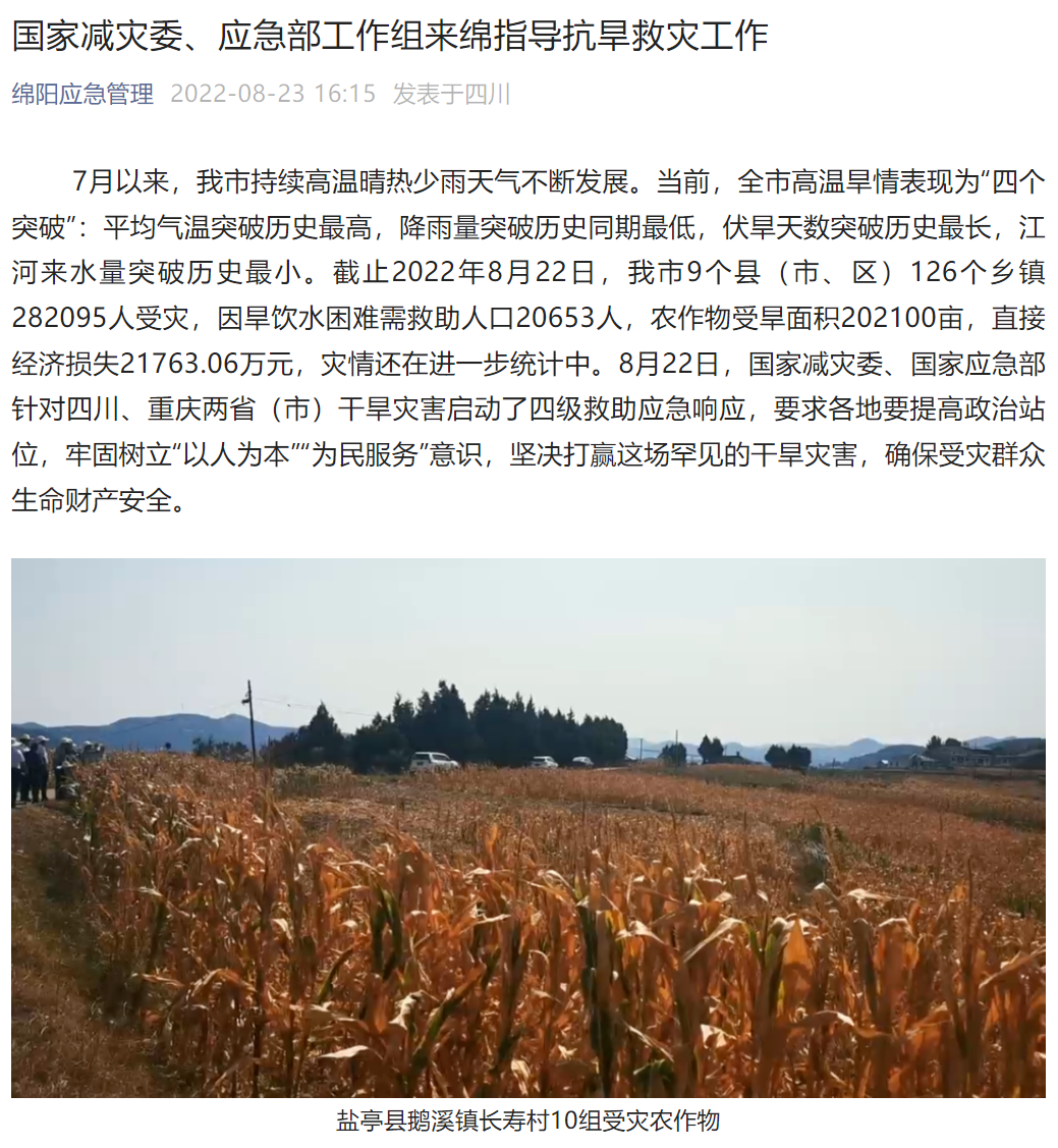 “绵阳应急管理”微信公众号8月23日消息,7月以来,绵阳市持续高温晴热少雨天气不断发展。当前,全市高温旱情表现为“四个突破”:平均气温突破历史最高,降雨量突破历史同期最低,伏旱天数突破历史最长,江河来水量突破历史最小。截至2022年8月22日,绵阳市9个县(市、区)126个乡镇282095人受灾,因旱饮水困难需救助人口20653人,农作物受旱面积202100亩,直接经济损失21763.06万元,灾情还在进一步统计中。8月22日,国家减灾委、国家应急部针对四川、重庆两省(市)干旱灾害启动了四级救助应急响应,要求各地要提高政治站位,牢固树立“以人为本”“为民服务”意识,坚决打赢这场罕见的干旱灾害,确保受灾群众生命财产安全。