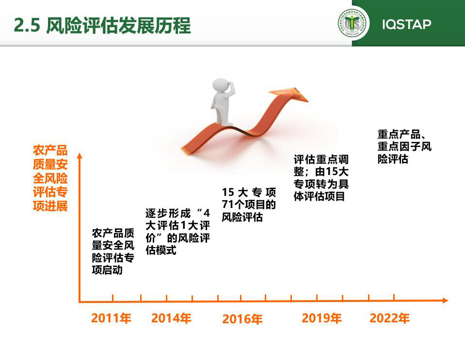 从农产品质量安全风险评估的发展历程来看,2014年,财政部和农村部将农产品质量安全风险评估作为国家重大财政专项,当时经费最高接近了一个亿。2011年,风险评估专项启动,2016年逐渐固定成了15大专项的评估模式,2019年开始以逐一解决重点问题的思路,针对重点产品中典型危害因子开展风险评估,持续至今。