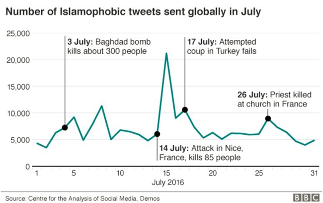 据BBC新闻18日报道,Demos的研究人员对今年3月到7月的英语推文进行了分析比对,发现在7月15日,也就是法国尼斯卡车恐袭案之后一天,带有“伊斯兰恐惧症”的推文飙升到21,190条,创下最高纪录。