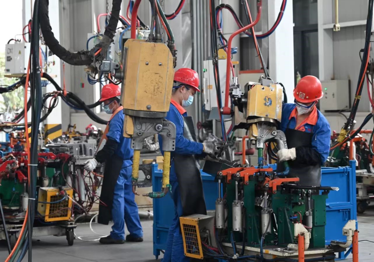 位于成都淮州新城的四川国腾制造有限公司,一个个机器人手臂正在作业,工人们都在自己的岗位上埋头忙碌。