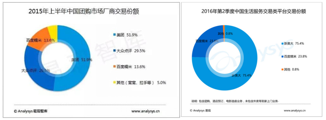 2015年上半年,在美团点评合并之前,双方在中国团购市场的交易份额分别为51.9%和29.5%。也意味着合并之后份额达到81.4%。而根据16年Q2季度报告显示,新美大是份额降到了75.4%。