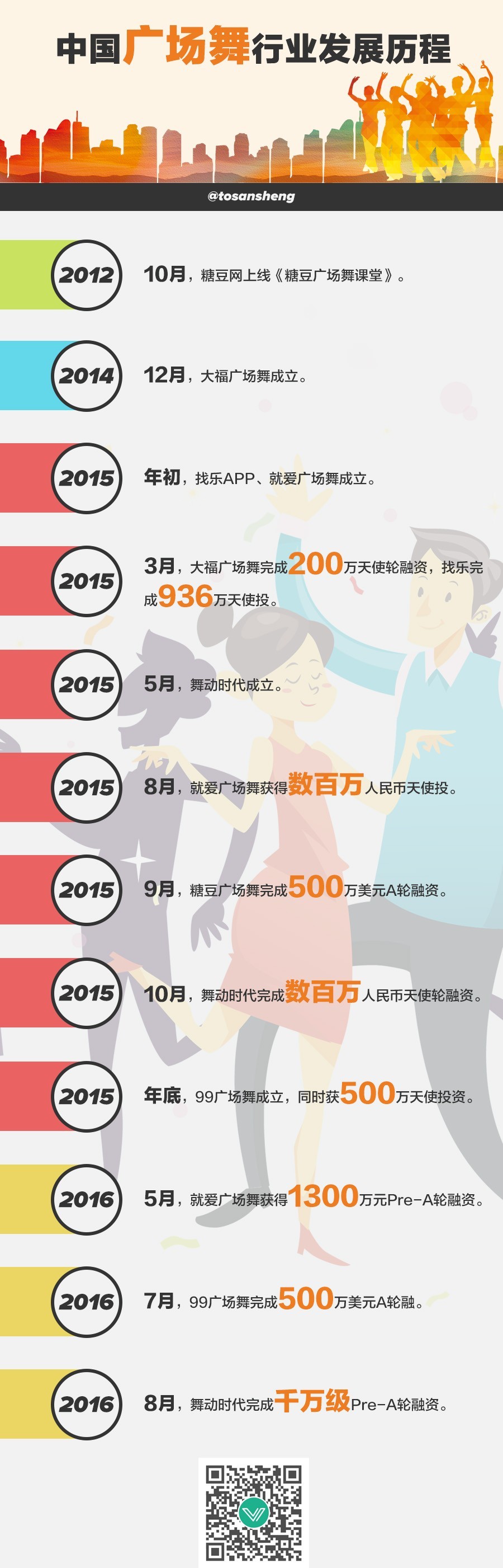 出乎方惠意料的是,他选择的并非“窄门”。在《报告》发表几个月后,广场舞迎来了资本的春天。2016年上半年,糖豆广场舞和99广场舞分别完成500万美元第二轮融资,就爱广场舞也获得1300万元Pre-A轮投资。8月,舞动时代也完成千万级第二轮融资。资本的大量涌入让广场舞行业真正热闹起来。