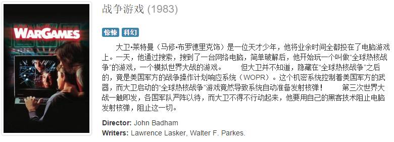 (大概情节是,天才少年大卫·莱特曼,利用黑客技术,入侵了美国的模拟战争系统,结果阴差阳错,拯救了世界。)