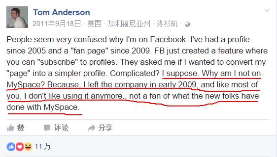 他还不忘捅老东家一刀:和大部分人一样,我已经不用 Myspace 了,不喜欢一个新人对 Myspace 做的一切。