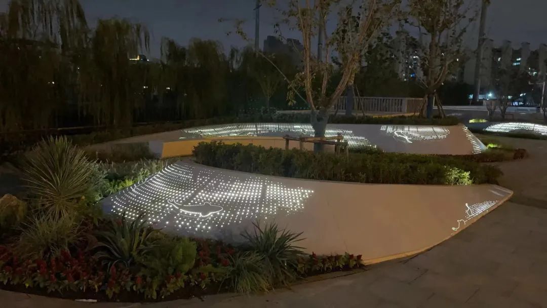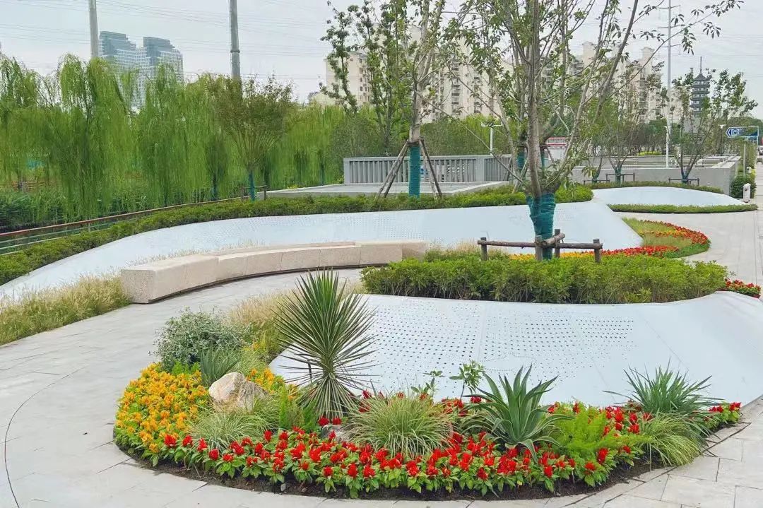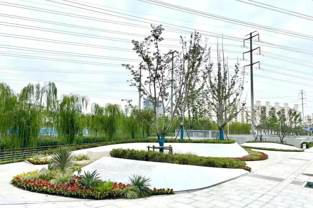 据了解,真如口袋花园位于曹杨路和铜川路交界的地铁口。在修建过程中,建造方利用自然地形,采用了流线型的设计手法。在种植设计方面秉持着生态、简洁的理念,用植物元素表现街区历史风貌,利用整形灌木塑造整洁的种植空间;沿河布置粉色花树打造浪漫花堤,与周边整体绿化景观相融合。在微风吹拂下,观赏草飘逸律动犹如水波荡漾,别有一番韵味。
