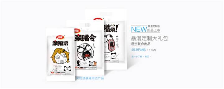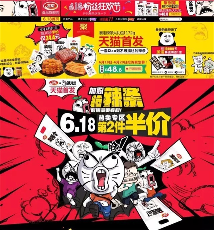 618粉丝节期间,卫龙还和暴漫跨界合作:卫龙辣条部分产品详情更新为暴漫系列,暴走大事件为卫龙贴广告,要知道暴走的每期视频点击都是几百万次的,可以想象如同海水一样的流量……