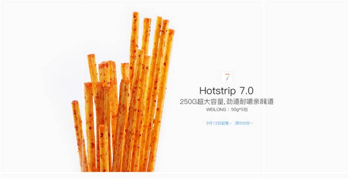 9月8日上午10时许,卫龙辣条天猫旗舰店进行了更新:“Hotstrip7.0,改变食界,条条是道”,“250G超大容量,劲道耐嚼亲嘴道”。