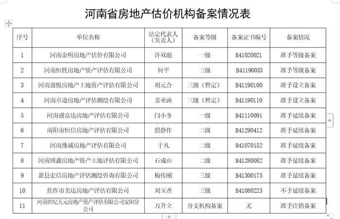 其中,焦作市美达房地产评估有限公司不予延续备案,河南世纪天元房地产资产评估有限公司安阳分公司,准予注销备案。