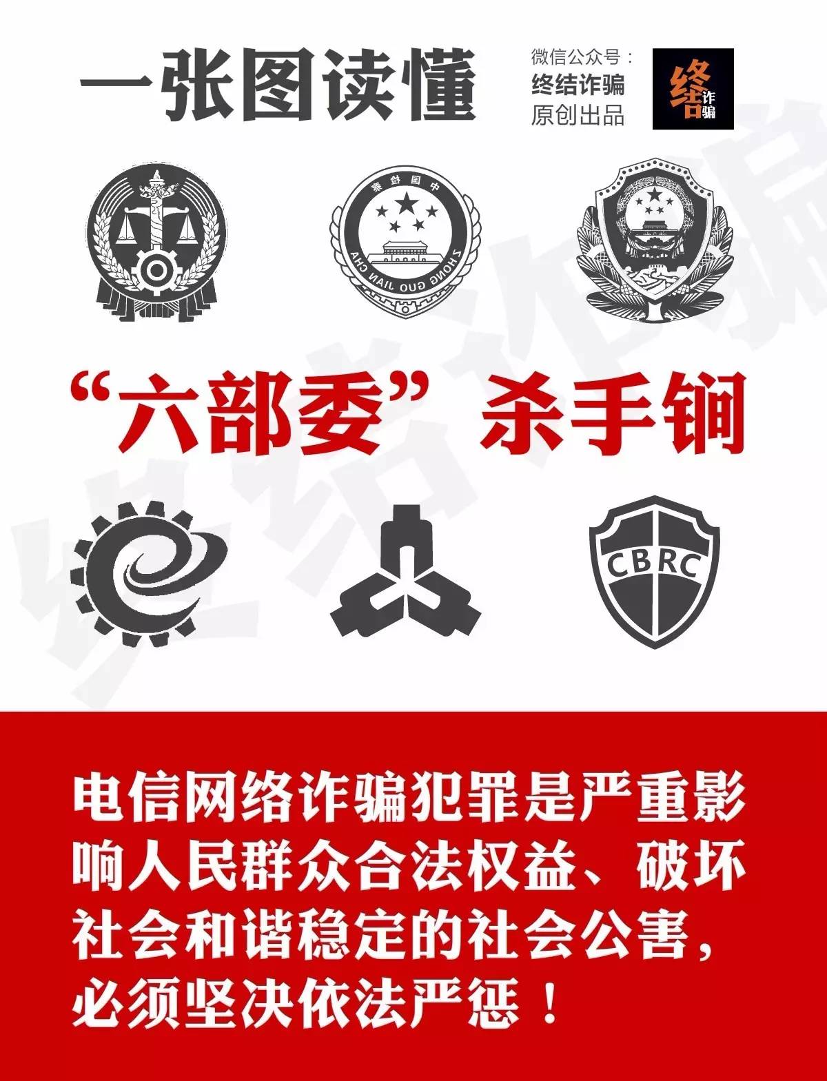背景:为了认真贯彻落实中央领导同志关于防范打击电信网络诈骗犯罪系列重要指示精神,按照国务院打击治理电信网络新型违法犯罪工作部际联席会议第三次会议有关部署,以更加扎实的各项措施有效防范、精准打击电信网络诈骗犯罪,切实保障广大人民群众合法权益,维护社会和谐稳定。最高人民法院、最高人民检察院、公安部、工业和信息化部、中国人民银行、中国银行业监督管理委员会六部门,今天联合发布《防范和打击电信网络诈骗犯罪的通告》。