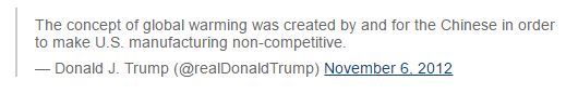 然而事实上,特朗普曾多次提起过这个话题。2012年11月6日,特朗普在Twitter上发文称“全球变暖的概念是中国人弄出来的,目的就是为了让美国的制造业失去竞争力。”