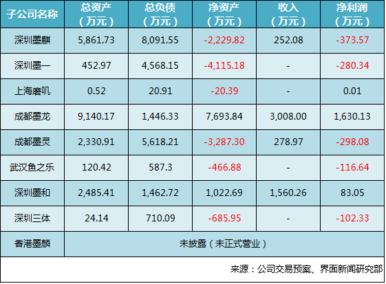第二就是深圳墨麟资不抵债的问题了。虽说上市公司购买的标的隶属于游戏公司,但抽丝剥茧后发现深圳墨麟的游戏资产却已经不那么吸引人。数据显示,墨麟旗下9家子公司中,已经有包括深圳墨麒、成都墨灵、深圳墨一、上海磨叽、武汉鱼之乐、深圳三体等6家子公司出现了资不抵债的情况。而可以为公司带来利润的也仅有成都墨龙一家子公司,前景堪忧。