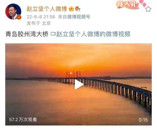 2月2日晚,青岛市委网信办主办的网络盛典上透露,2022年6月,时任中国外交部发言人赵立坚先后在推特和微博上转发了一段视频:“落日熔金,青岛胶州湾大桥如卧龙横卧碧海之上,巍峨壮丽。”