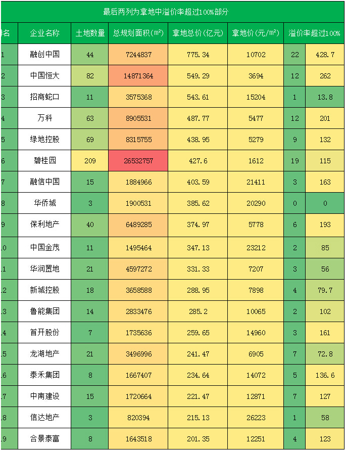 拥有充裕资金和低成本优势的央企,被认为是抬高这轮地价的主角。中国金茂是这轮拿地热潮中成本最高的房企,平均地价高达2.3万元每平方米,华侨城的地价也超过2万元每平方米。另外能源央企如中国电建、葛洲坝等也是这轮地王热潮中的积极参与者。