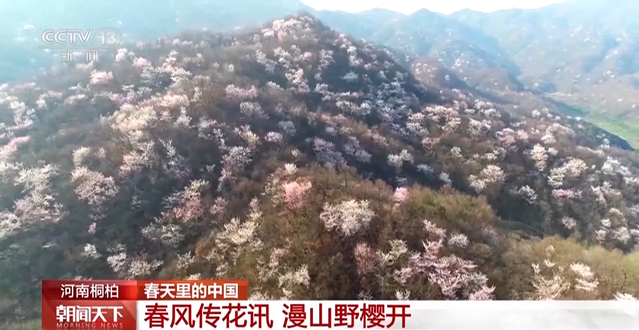 在河南南阳桐柏县,春风吹过,漫山的野樱花从谷底到山顶次第盛开。明暗交错的光影之下,花海呈现出深浅不一的色彩,装扮着连绵起伏的山峦。