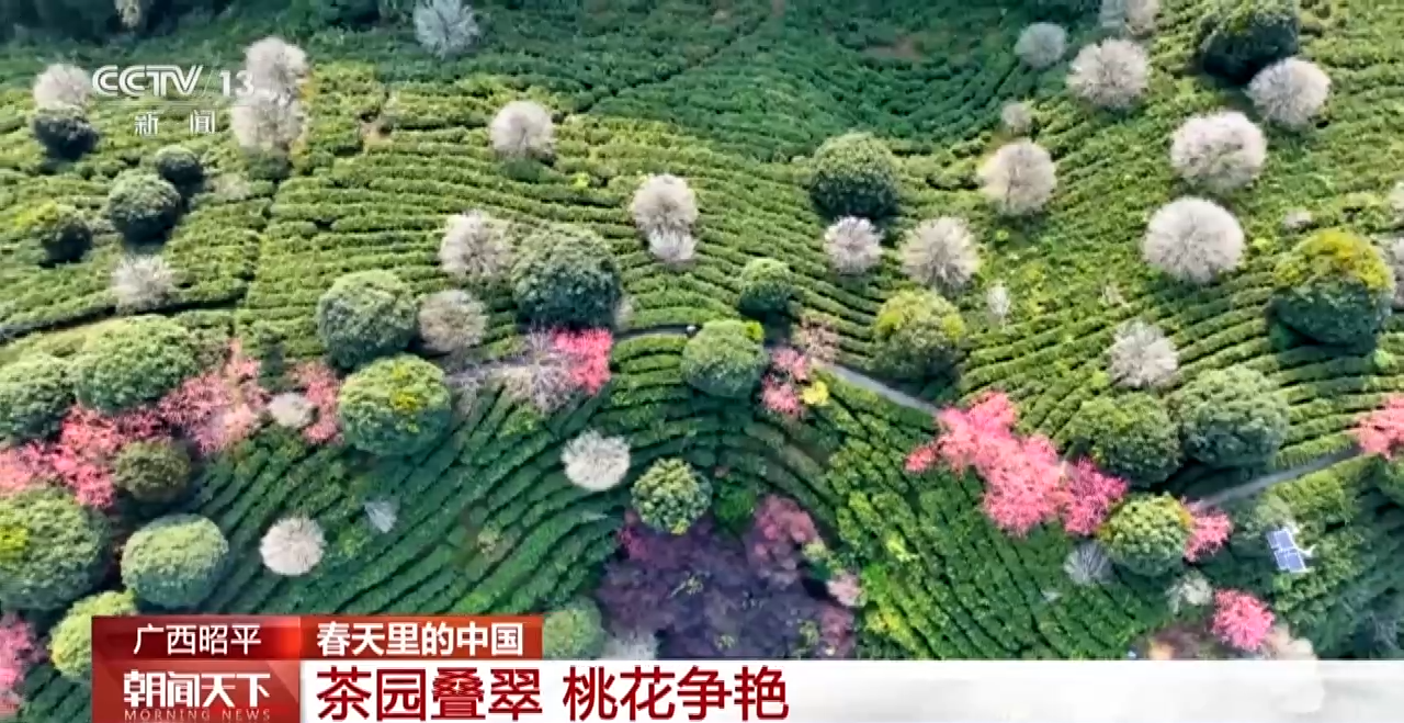 而在广西贺州昭平县的一片高山茶园,从空中俯瞰,茶树绿得生动、桃花红得活泼,美得恰如其分。