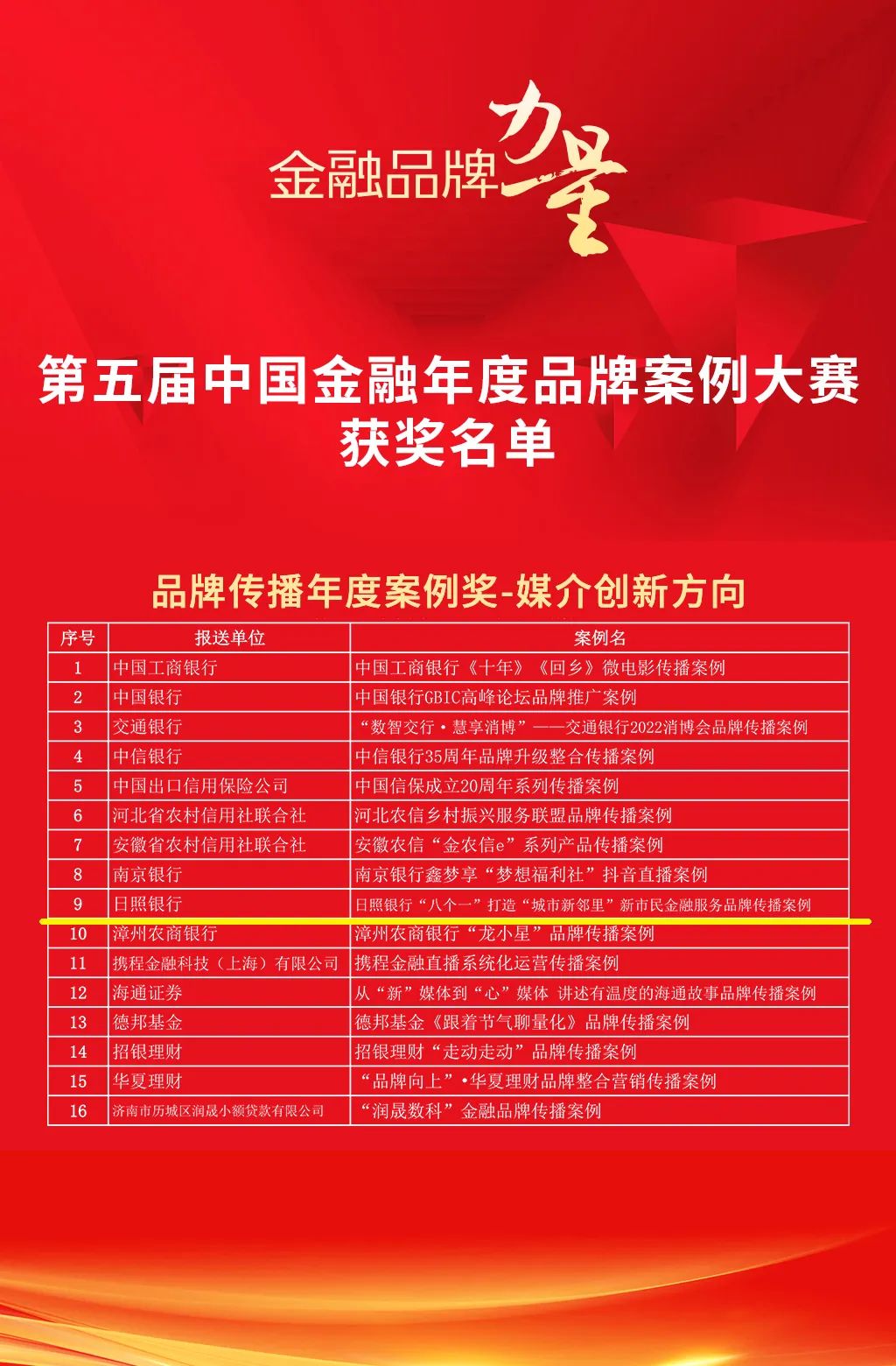 中国金融品牌年会暨第五届中国金融年度品牌案例大赛由中国金融出版社主办,《中国金融》《金融博览》《金融博览 财富》杂志承办,中央财经大学金融品牌研究所、中国人民银行清算总中心、上海黄金交易所、农信银资金清算中心等协办和支持。大赛共收到来自209家金融机构的425个案例,经过网络投票、专家评审等环节,共有116个案例获奖,其中,16个案例获得品牌传播年度案例奖-媒介创新方向。