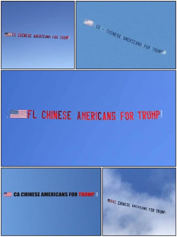 飞行广告活动最早是由亚利桑那州凤凰城的特朗普华人支持者组织。10月15日他们第一次使用飞机携带挺特朗普的巨幅广告“AZ CHINESE AMERICANS FOR TRUMP”(亚利桑那州华裔美国人支持特朗普)在凤凰城上空飞行了4个小时。10月18日,丹佛市的华人也租了一架飞机携带巨幅挺特朗普标语在丹佛上空飞行。