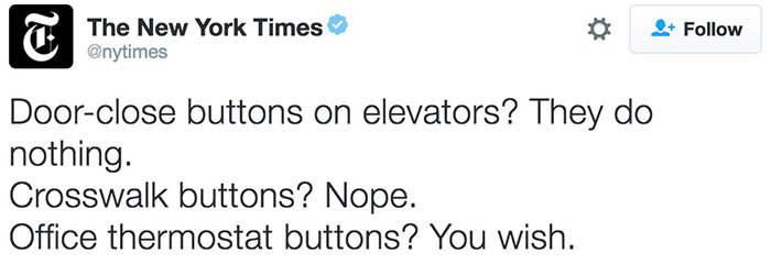 你有没有想过,为什么电梯里的开门和关门按钮总是反应迟钝,按下去似乎没有任何效果?最近纽约时报文章披露了其中原因:电梯关门按钮不起作用,是因为它们本来就是假的。