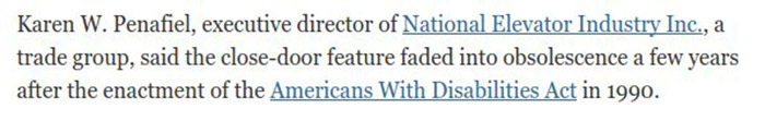 文章中,美国电梯工业协会的负责人透露,早在1990年美国残疾人法案颁布后,电梯中的关门按钮就被剥夺实际功能,设计成了一个只具有安慰性质的按钮。