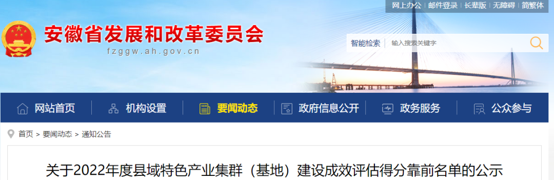 4月26日,安徽省发展改革委网站发布《关于2022年度县域特色产业集群(基地)建设成效评估得分靠前名单的公示》。