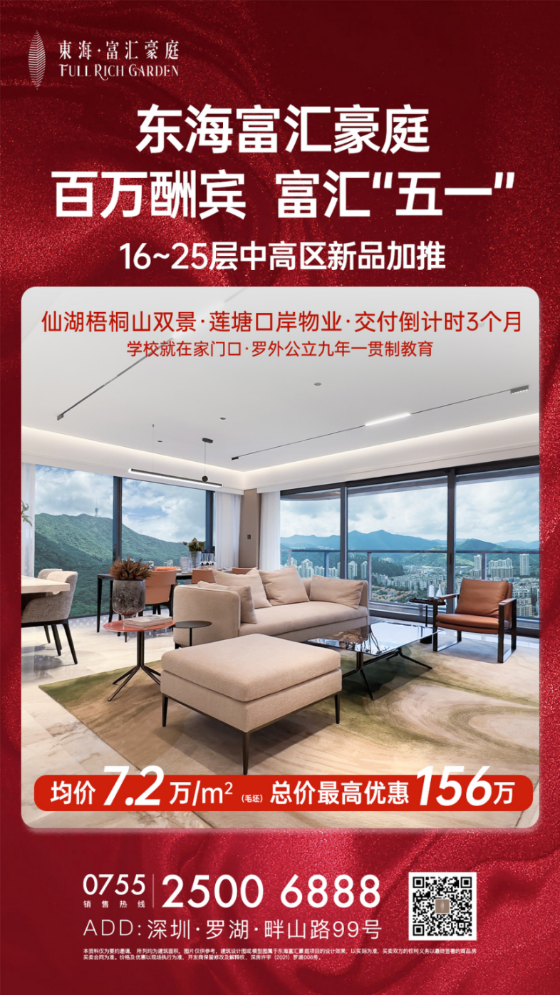 五一期间,东海富汇豪庭,百万酬宾,富汇“五一”,中高区新品加推,均价7.2万/㎡起(毛坯),总价最高优惠156万。