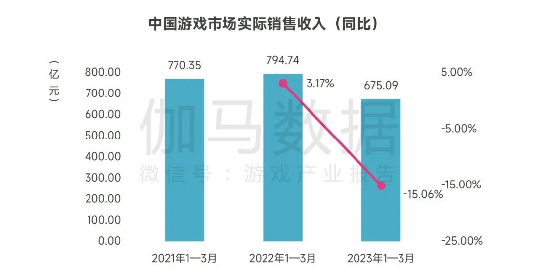 2023年1—3月,中国游戏市场实际销售收入675.09亿元,环比上升15.61%,同比下降15.06%,春节假期与新品表现共同带动。