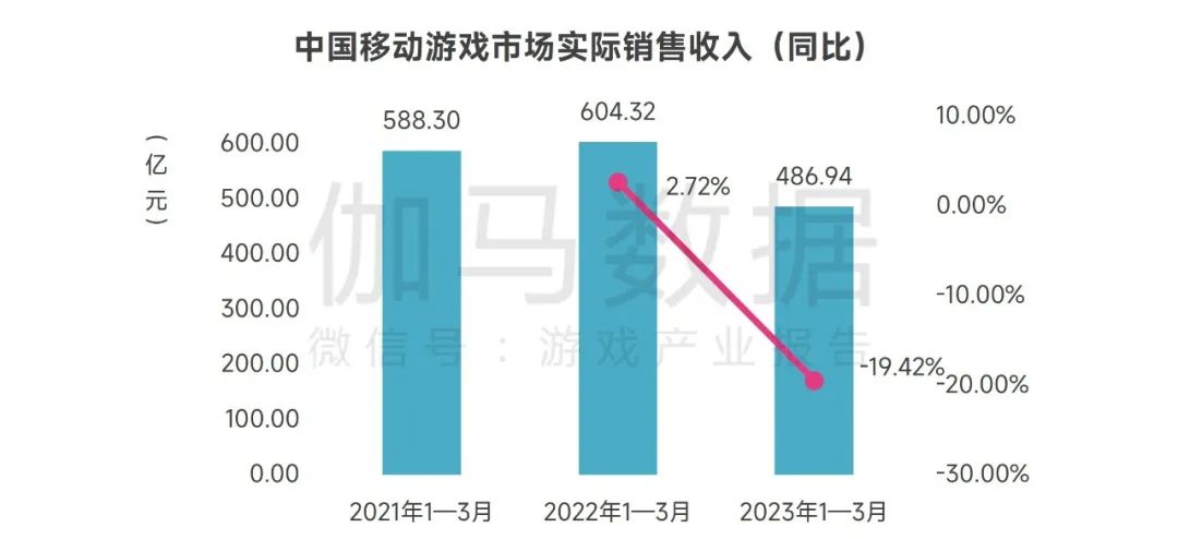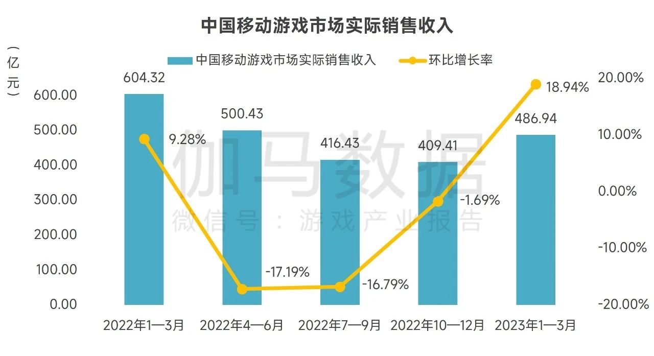 2023年1—3月,中国移动游戏市场实际销售收入486.94亿元,环比上升18.94%,同比下降19.42%。