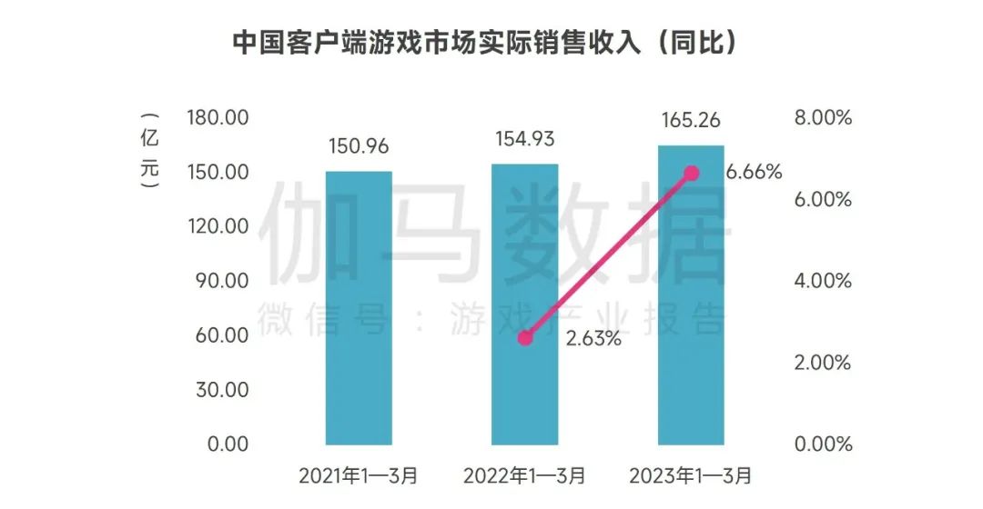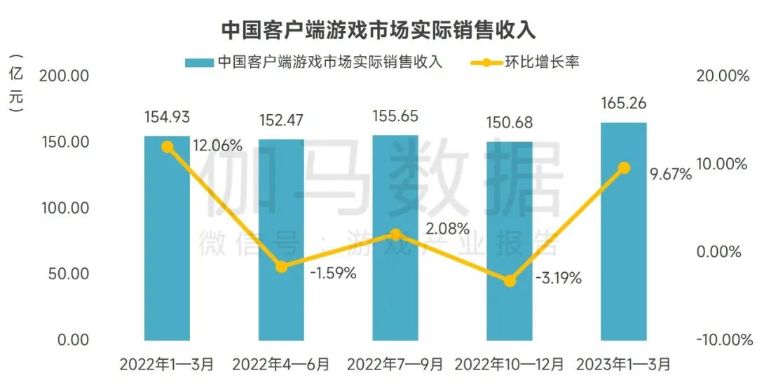 2023年1—3月,中国客户端游戏市场实际销售收入达165.26亿元,环比增长9.67%,同比增长6.66%,多款头部产品运营活动效果较好。