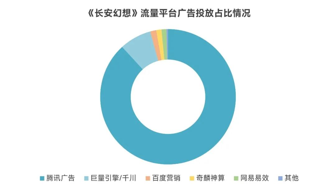 《长安幻想》上线期间广告投放量较大,上线当天广告投放量达24034条。产品上线后保持着较高频率的版本更新,2023年3月共进行6次大型版本更新,其中3月26日版本更新 “将进酒”资料片后游戏进入iOS游戏畅销榜TOP3。广告投入与版本更新共同助力产品流水保持在较高水平。从具体广告投放平台来看,《长安幻想》广告投放主要集中于腾讯广告,占比达88%。