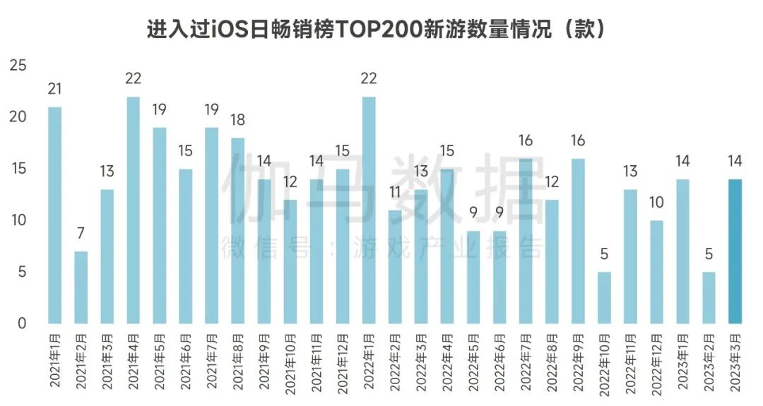 2023年3月,进入过iOS日畅销榜TOP200的新游14款,环比增加180%,比前两年同期均多1款。