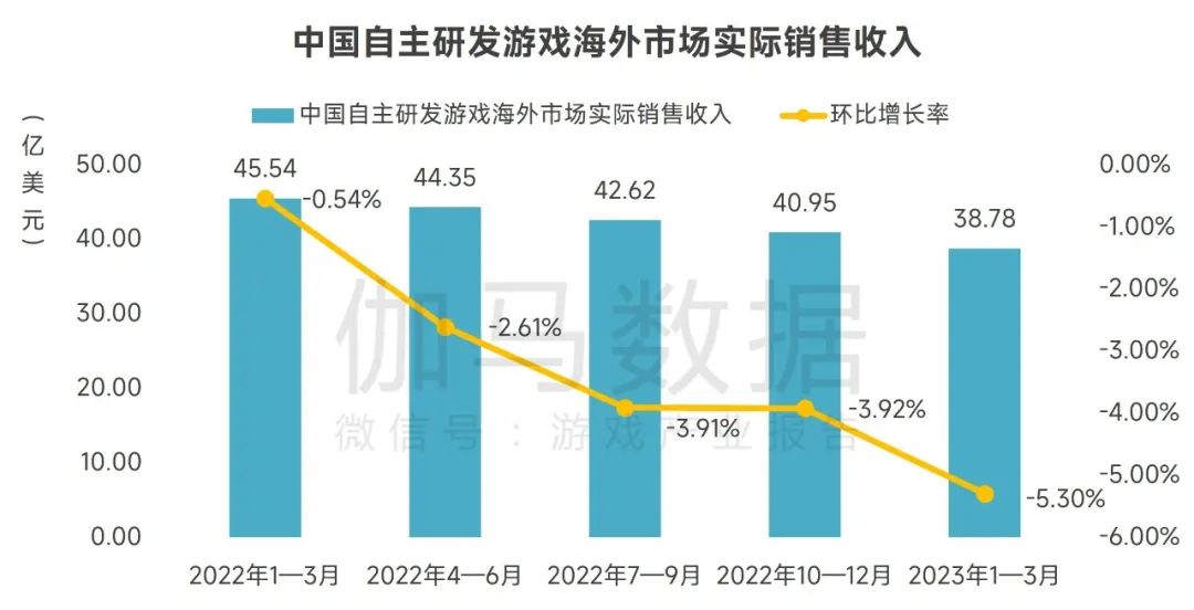 2023年1—3月,中国自主研发游戏海外市场实际销售收入为38.78亿美元,环比下降5.30%,连续5个季度呈下降趋势。一季度环比下降主要由部分头部产品收入下滑、新品未带来较大增量导致。