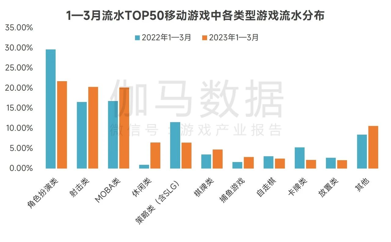2023年1—3月,流水TOP50移动游戏中角色扮演类流水份额排名第一,但不及去年同期。
