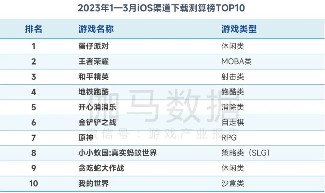 2023年1—3月iOS渠道下载测算榜TOP10中,休闲类产品《蛋仔派对》登顶,另一款入榜休闲类产品为《贪吃蛇大作战》。