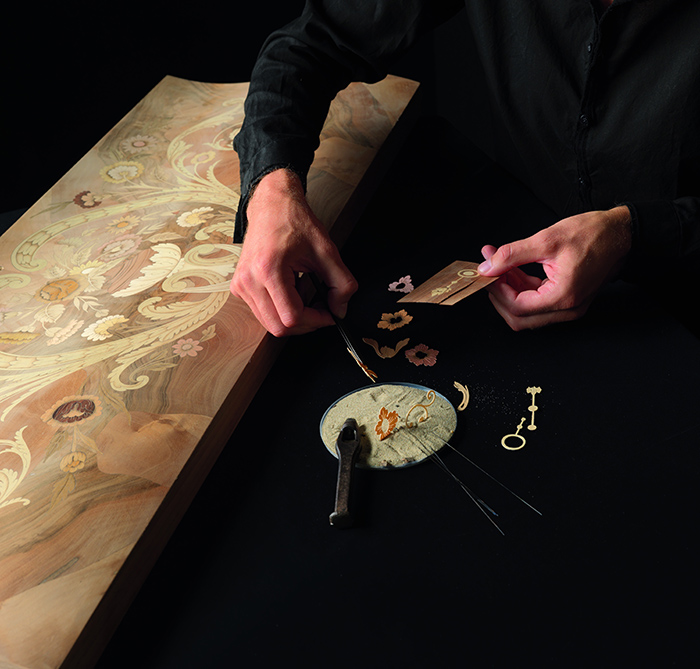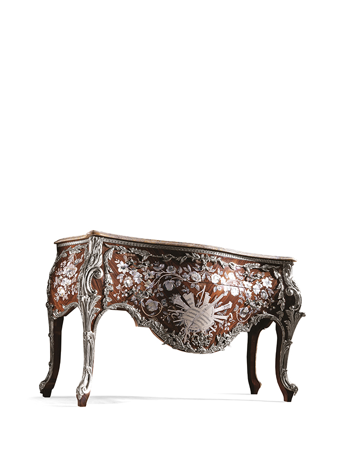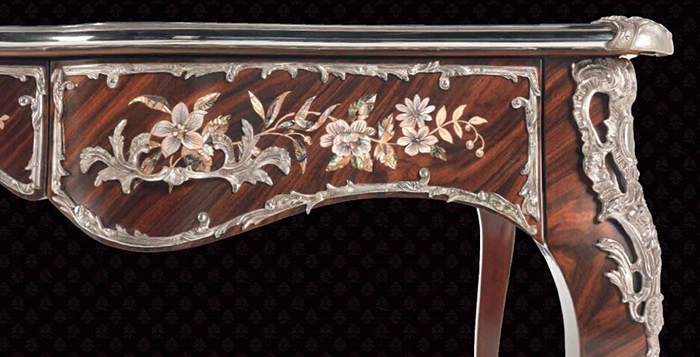 太阳王书桌(RoiSoleil Desk),原版为腓特烈大帝的御用书桌,现珍藏于德国波茨坦无忧宫。其复刻版的桌面纹饰由五种来自世界各地、颜色迥异的珍珠母贝与限量库存象牙镶嵌而成,镀银青铜则使用手工脱蜡铸造并凿刻。这件方桌由资深专家和手工艺人精心打造,蕴含着意大利奢华手工制品的最高水平。